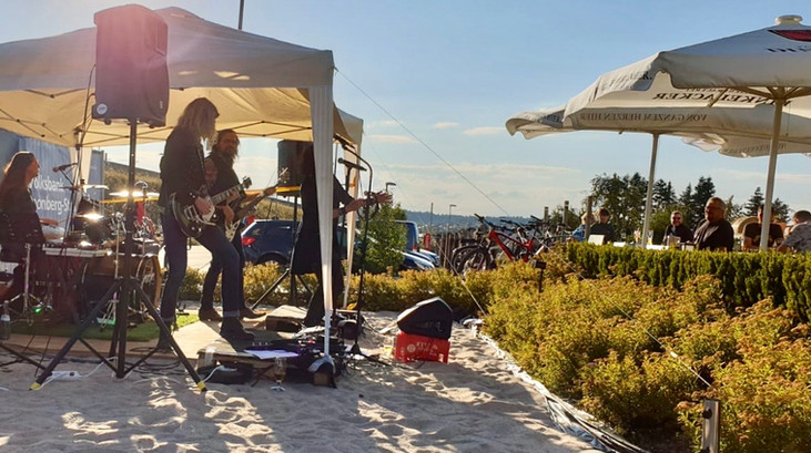 Der Aufbau war bereits schon einmal sehr ungewohnt, da wir mit unserem Equipment durch Sand zur Bühne mussten. Sowas hat man auch nicht oft. War doch schon gleich ein bisschen Urlaubsfeeling. Frank und sein Team haben den Beach sehr schön hergerichtet und für uns stand eine Bühne mit Pavillon bereit, der wie es sich herausstellte uns nicht ganz wohlgesonnen war.